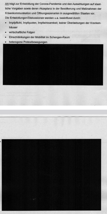 Apollo News hat sich die 178 Seiten durchgelesen und ist ernüchtert. Denn neben den seitenlangen Anwesenheitslisten, die aus Datenschutzgründen geschwärzt wurden, sind die Protokolle, die die Sitzungen von Dezember 2021 bis Mai 2022 umfassten, auch an wichtigen Stellen geschwärzt. So wurden Lageberichte des Auswärtigen Amtes, die unter anderem über Lockerungen im Ausland berichteten, großzügig geschwärzt.