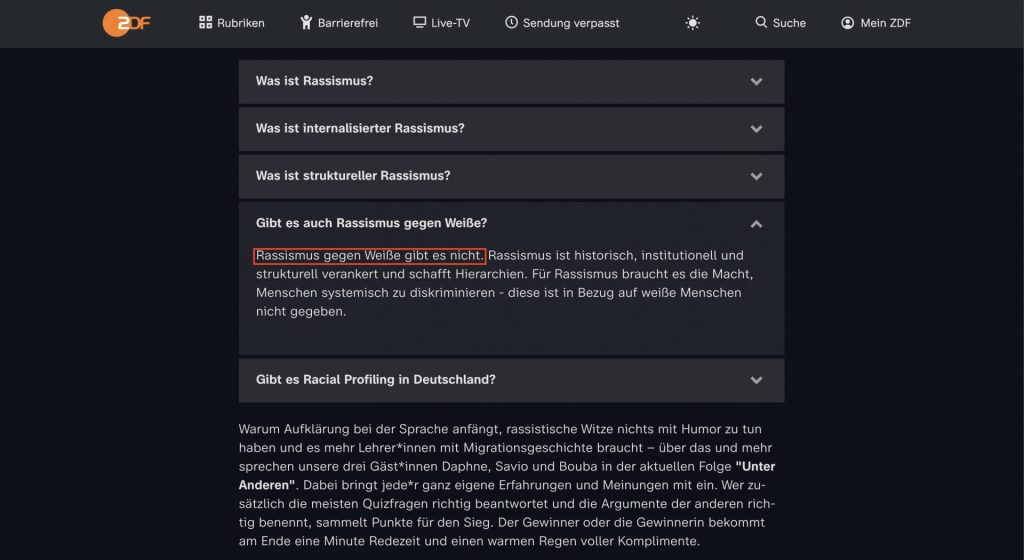 Weil weiße Menschen also hierarchisch immer machtvoller Positionen einnehmen als nicht-weiße Personen, könne es laut ZDF per se keinen Rassismus gegen Weiße geben. Die Frage, was Rassismus sei, beantwortet das ZDF mit den Worten „Rassismus geht von unterschiedlichen menschlichen ‚Rassen‘ aus und betrachtet diese je nachdem als überlegen oder minderwertig. So reduziert er Menschen auf äußere Unterschiede (z. B. ihre Hautfarbe, Herkunft, oder Sprache) und schreibt ihnen auf dieser Grundlage bestimmte Wesenszüge und Charaktereigenschaften zu.“